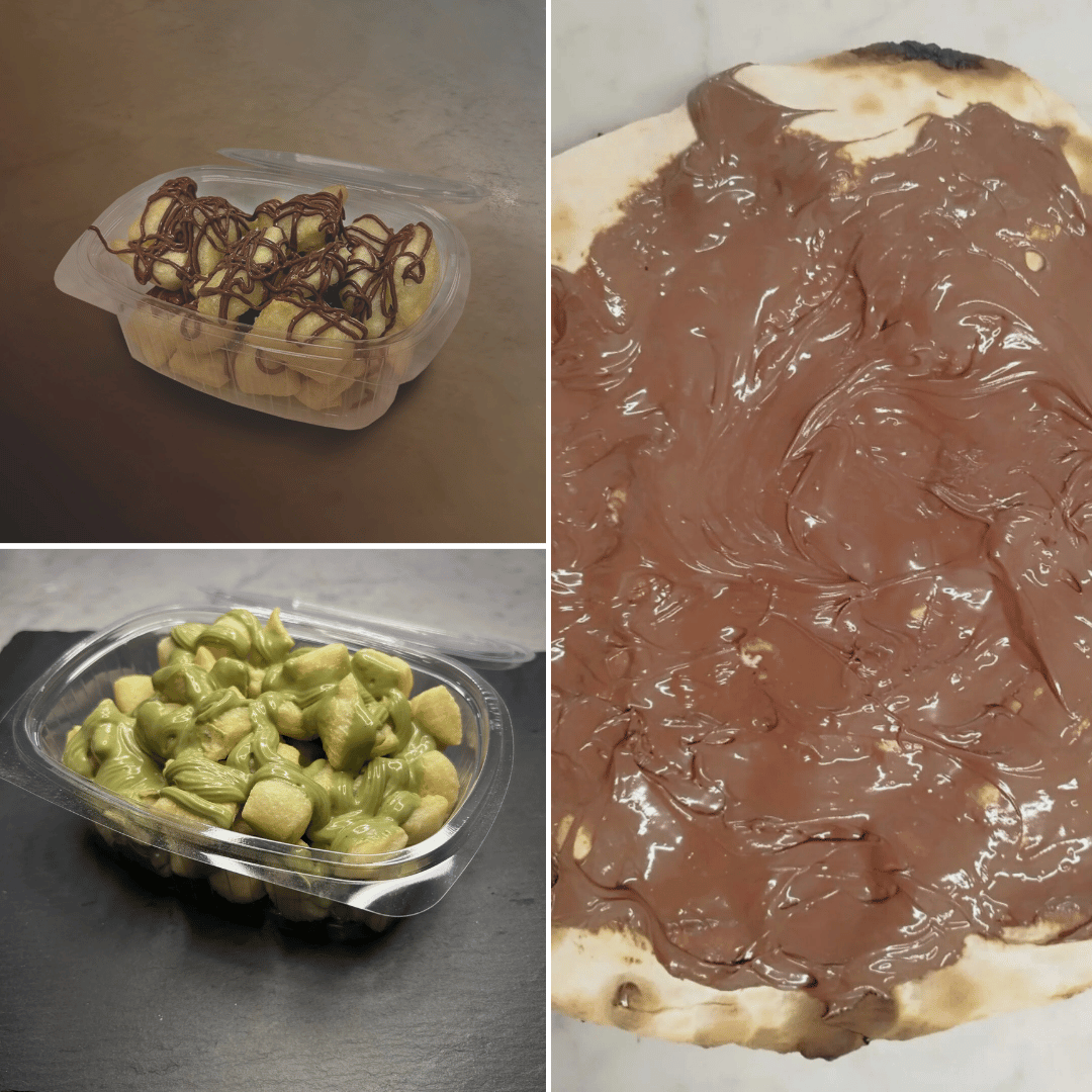 Il dolce del fontanile è fatto con l’imapasto della pizza tagliato a quadrini e poi fritti, infine viene condito con la Nutella o in alternativa con crema di pistacchio.